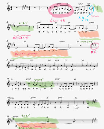 歌からの始まりは、別世界への冒険、どこかへ飛んでいくイメージ。歌い出しのメロディーを駆け上がりにして、伸ばす音で発声を変えて飛翔感を高めている。