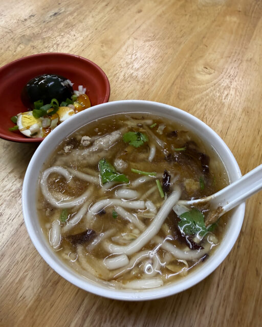 台東の米台目(ミータイムー Mǐ tái mù)は、お米のうどんのような麺類。鰹節の香りがして知ってる味…と思いました。おかずにピータン頼みました。